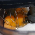 Ucieranie masy: Jajka przełóż do miski malaksera i dodaj cukier. Ucieraj przez kilka minut, aż uzyskasz białą masę.