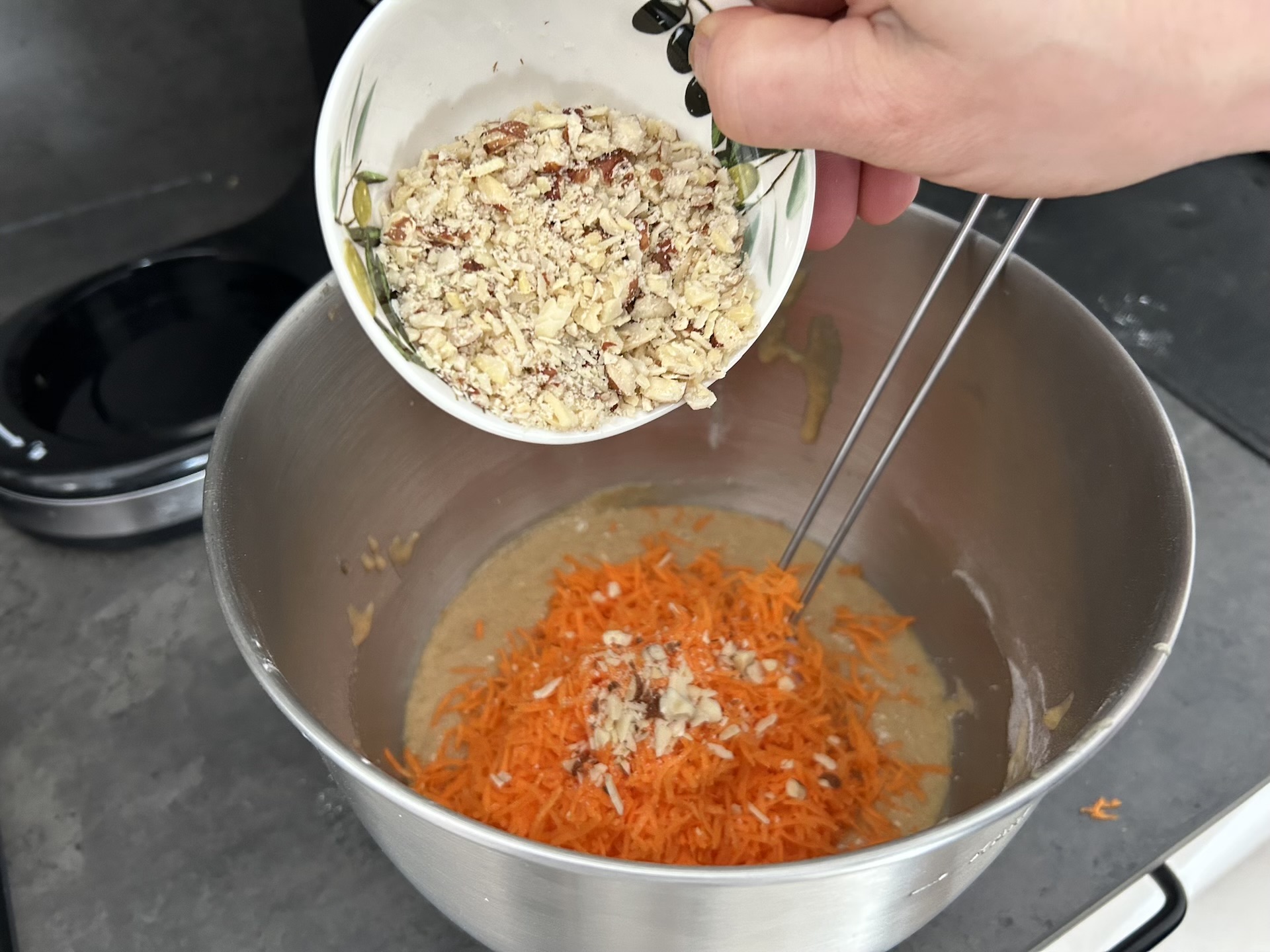 Na koniec dodaj startą marchewkę i, opcjonalnie, posiekane orzechy. Dokładnie wymieszaj, aby składniki się połączyły.