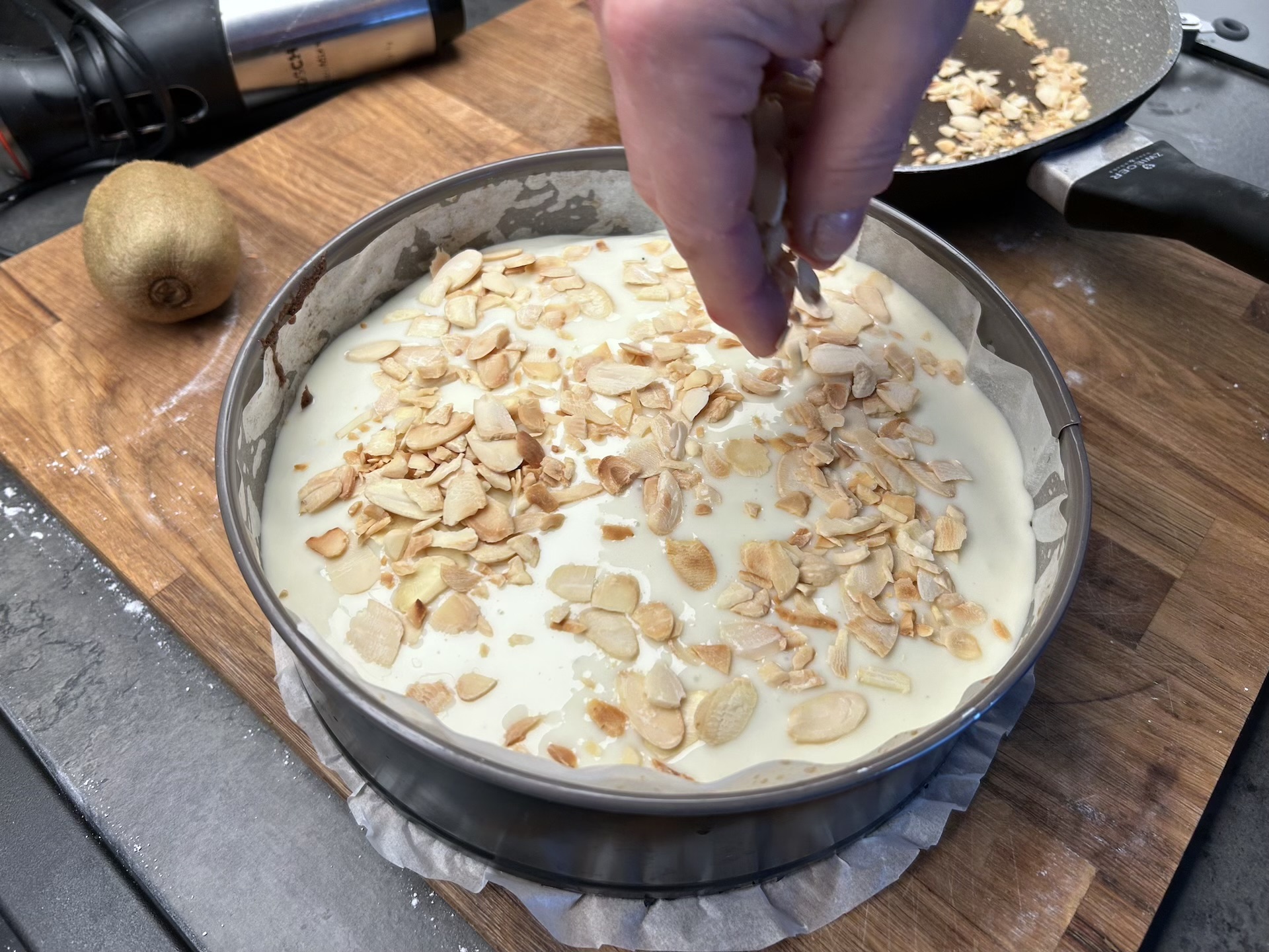 Rozprowadź lukier równomiernie na wierzchu ciasta i posyp, opcjonalnie, uprażonymi płatkami migdałów.