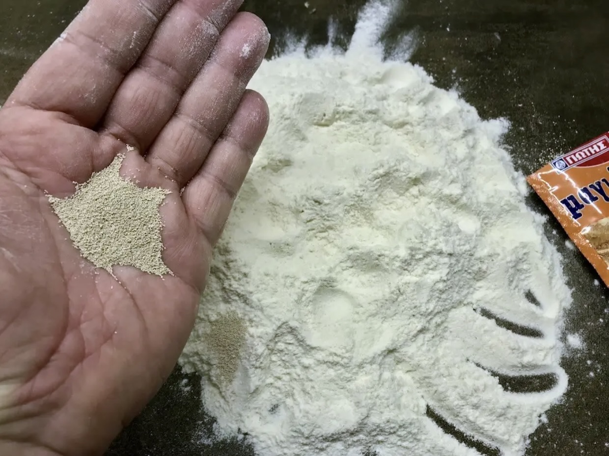 Przygotowanie składników suchych: Przesiej mąkę na blat. Dodaj pół łyżeczki soli i dokładnie wymieszaj z mąką. Następnie dodaj suszone drożdże i ponownie wymieszaj.