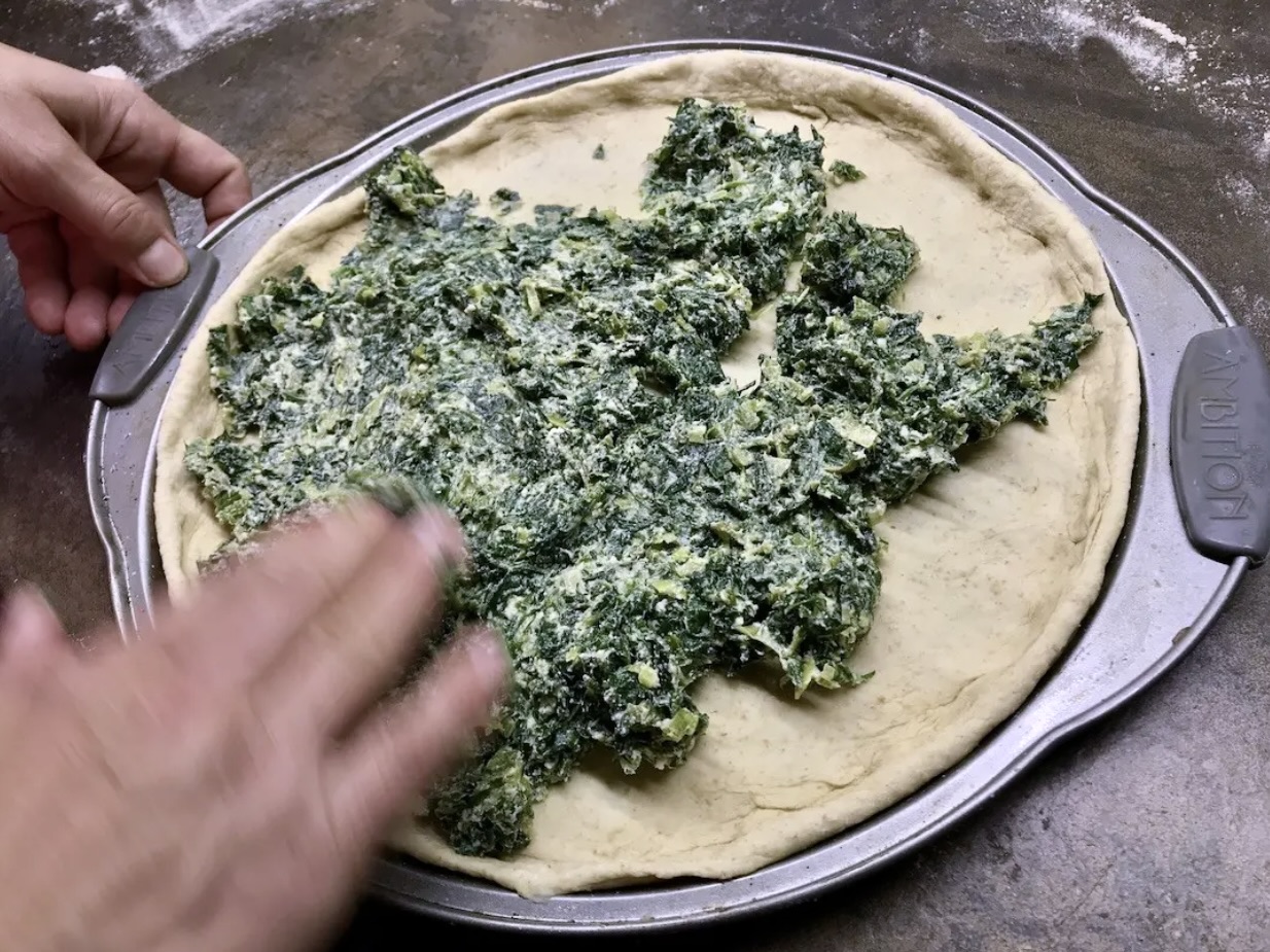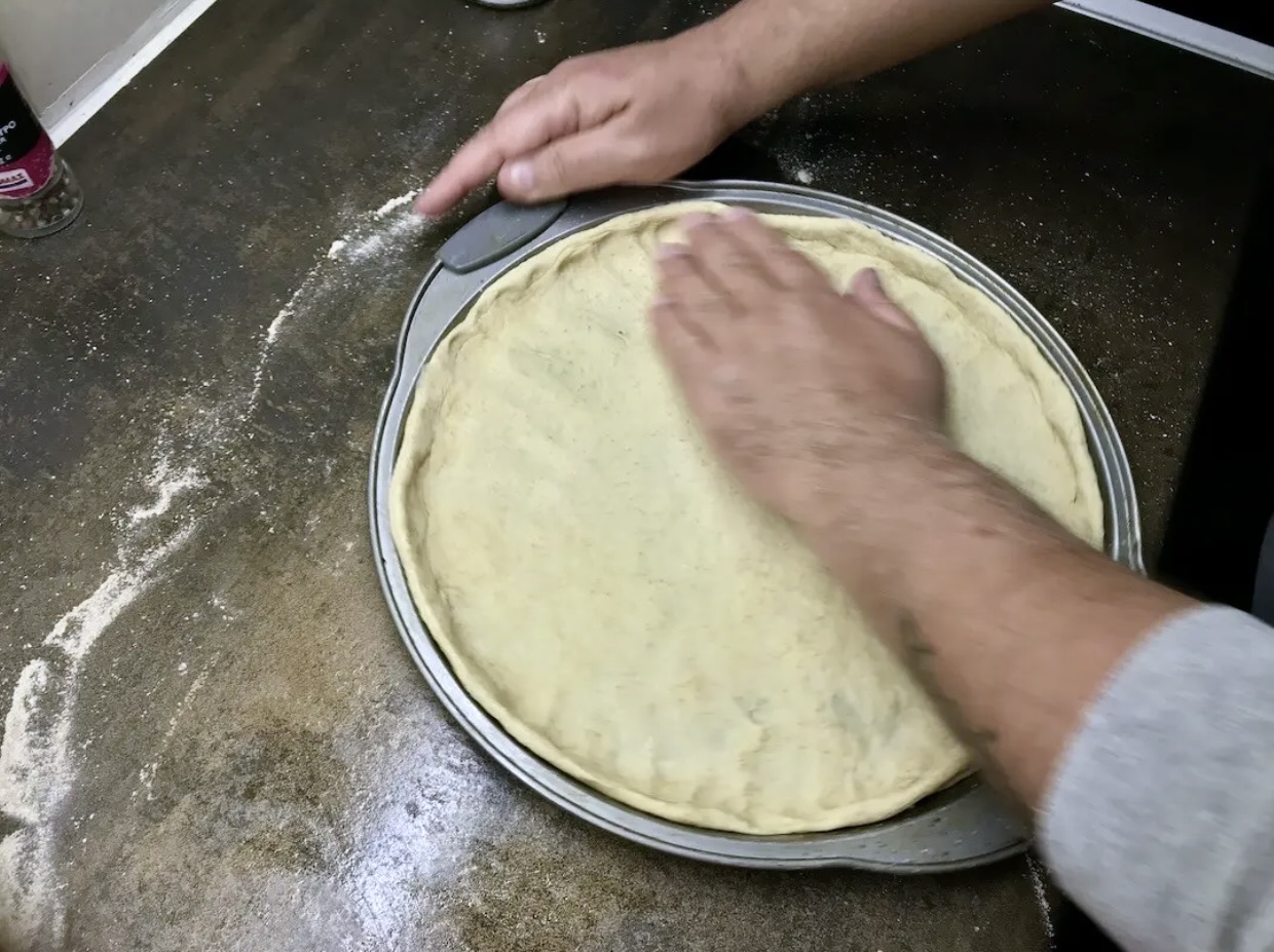 Rozwałkowanie/Rozgniatanie: Wyłóż ciasto na blachę wysmarowaną oliwą (np. o średnicy 30 cm). Rozgniataj delikatnie ciasto od środka na zewnątrz formy, dbając o jednakową grubość na całej powierzchni, szczególnie na brzegach.