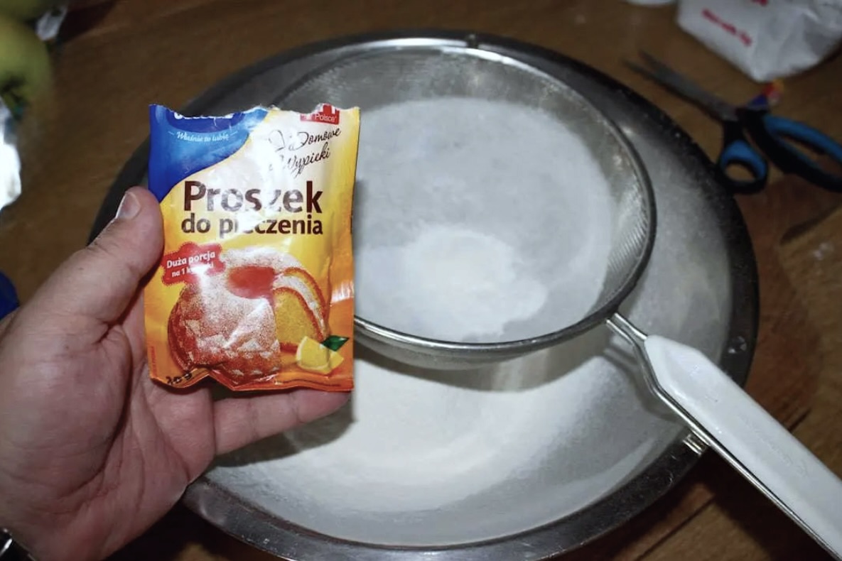 Do dużej miski przesiej 360 g mąki pszennej i dodaj 10 g proszku do pieczenia. Wymieszaj.