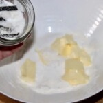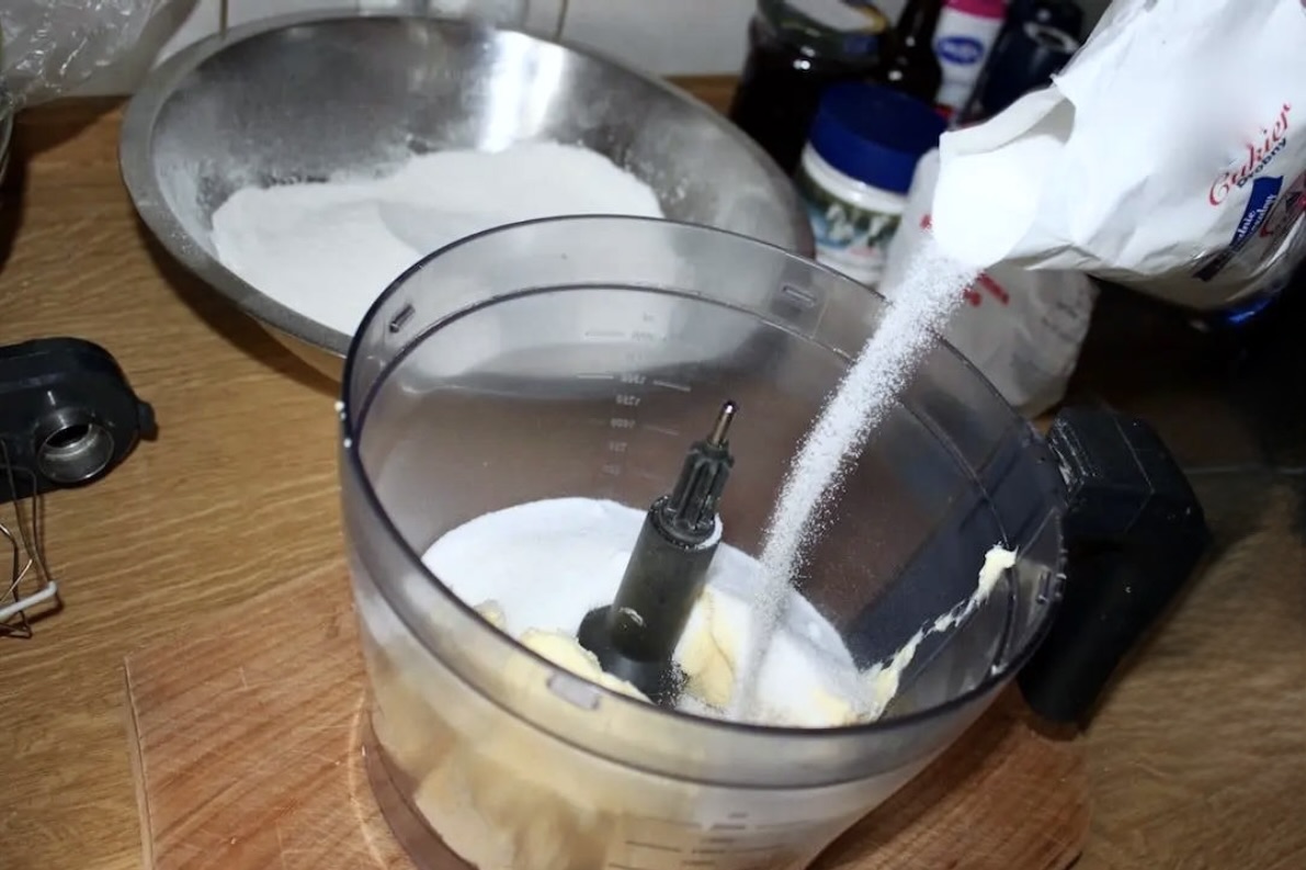 Do miski malaksera (lub innej) włóż 250 g miękkiego masła, cukier waniliowy/wanilię, 180 g drobnego cukru oraz startą skórkę z cytryny. Ucieraj kilka minut, aż masa zrobi się biała.