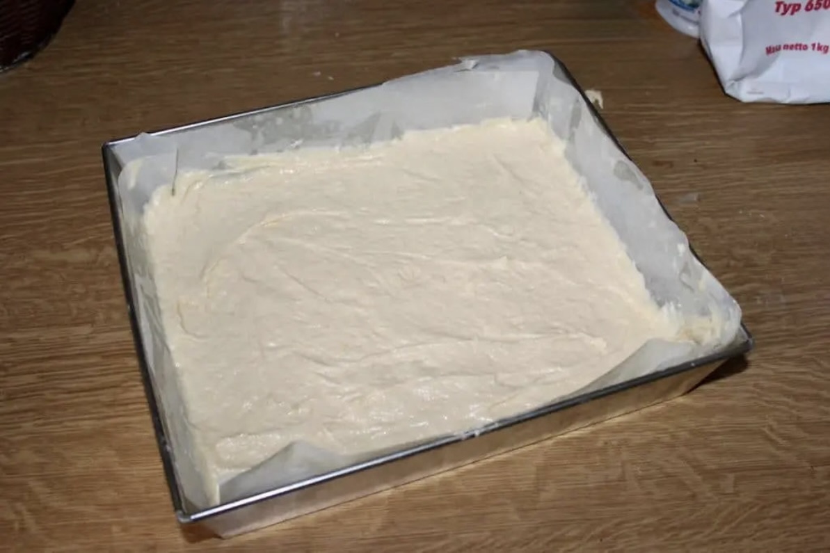 Blachę o wymiarach 24×26 cm wysmaruj lekko olejem i wyłóż papierem do pieczenia. Rozłóż na niej ciasto.