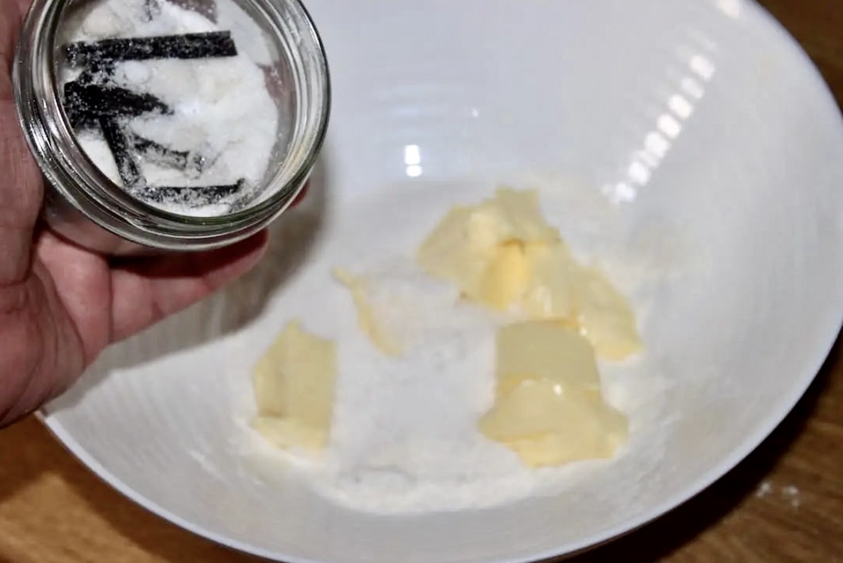 W osobnej misce połącz i krótko wyrabiaj 100 g mąki pszennej, 70 g miękkiego masła, 1 łyżeczkę cukru waniliowego i 50 g cukru pudru (lub drobnego). Otrzymasz ciasto na kruszonkę.