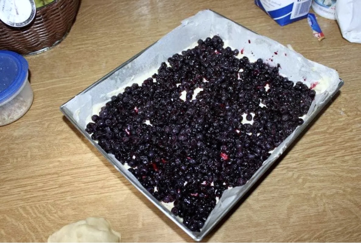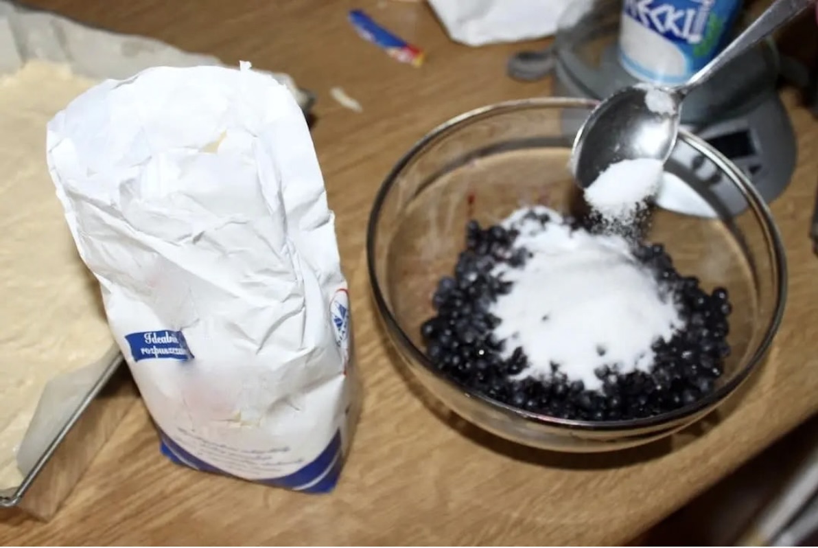 Borówki wymieszane z cukrem szybko rozłóż na cieście w blasze.