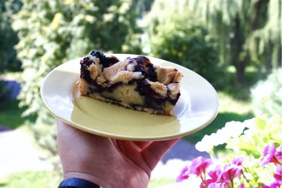Ciasto z borówkami najlepiej smakuje, gdy jest wilgotne i przesiąknięte smakiem borówek.
