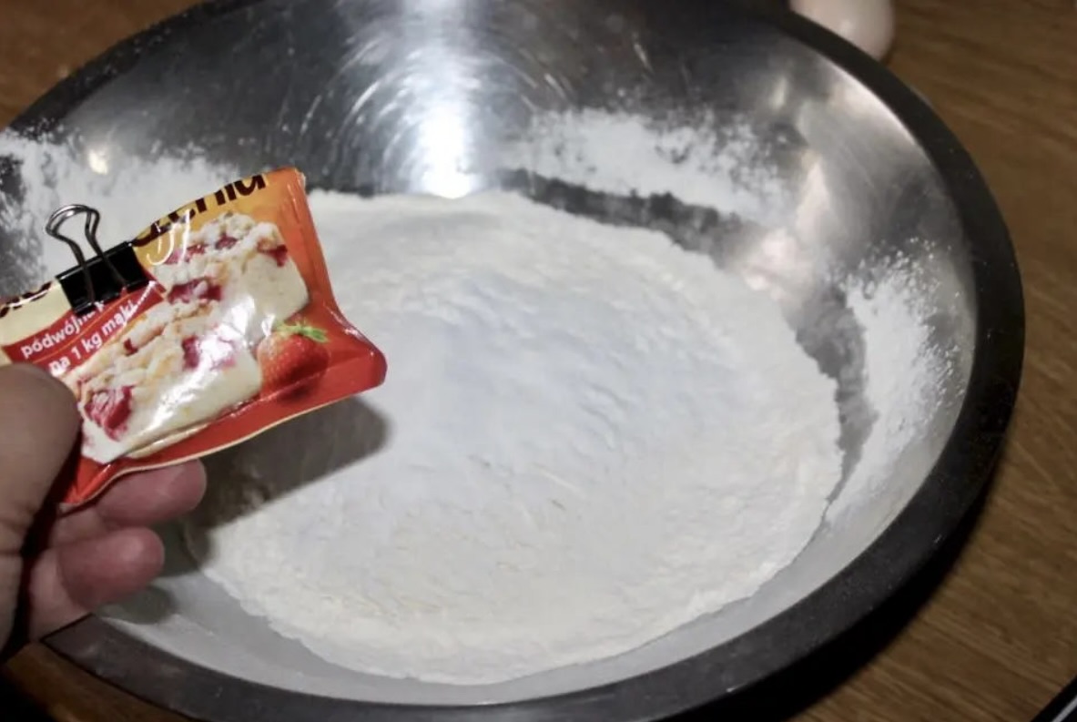 Do osobnej miski przesiej mąkę z proszkiem do pieczenia.
