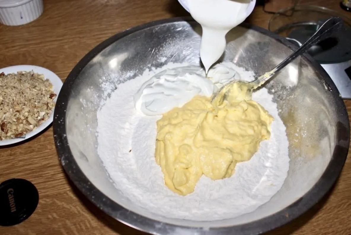 Dodaj do mąki wcześniej przygotowaną masę maślaną oraz jogurt naturalny. Całość dokładnie wymieszaj (ciasto będzie dosyć gęste).