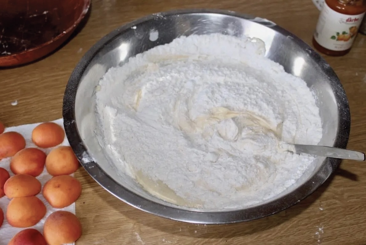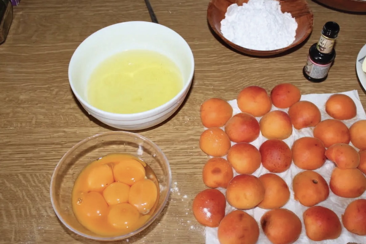 Przygotowanie składników: Morele przekrój na pół, a następnie wypestkuj. Oddziel żółtka od białek. Formę (zalecana blacha o wymiarach ok. 28×26 cm) wysmaruj masłem i oprósz mąką.