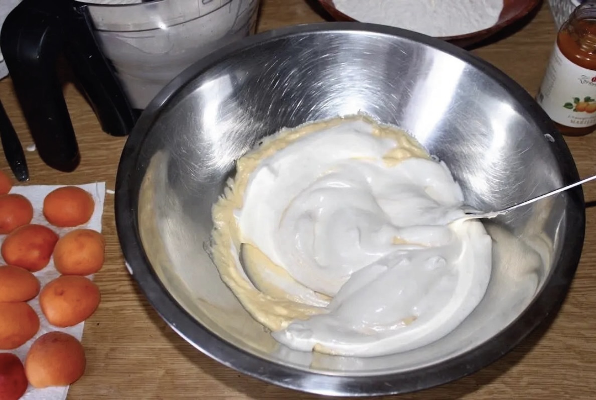 Łączenie: Ubita pianę delikatnie wmieszaj do masy maślanej. Na koniec partiami (po 2 łyżki) dodawaj mąkę, delikatnie mieszając, aż ciasto będzie gładkie.