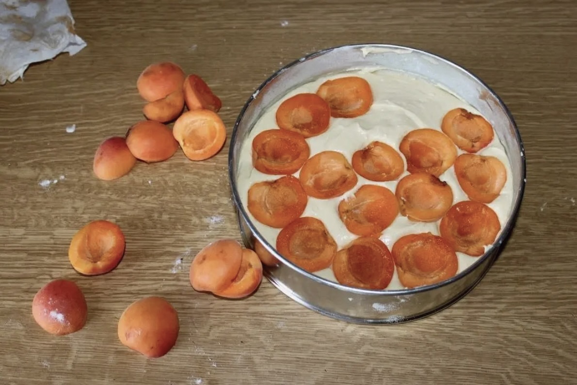 Pieczenie: Przelej ciasto do formy, a następnie wyrównaj. Na wierzchu gęsto układaj morele wnętrzem do góry (zapobiega to puszczeniu soku w głąb ciasta i powstaniu zakalca). Piecz w temperaturze 175°C przez ok. 40–50 minut (do tzw. suchego patyczka).