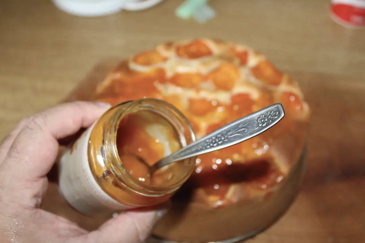 Wykończenie: Roster morelowy (lub gęsta konfitura morelowa) do posmarowania wierzchu, cukier puder.