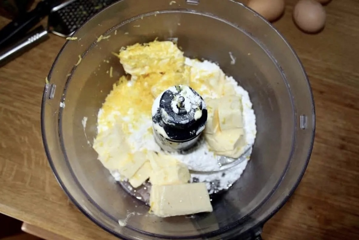 Do miski malaksera włóż miękkie masło, startą skórkę z cytryny, cukier puder i cukier waniliowy.