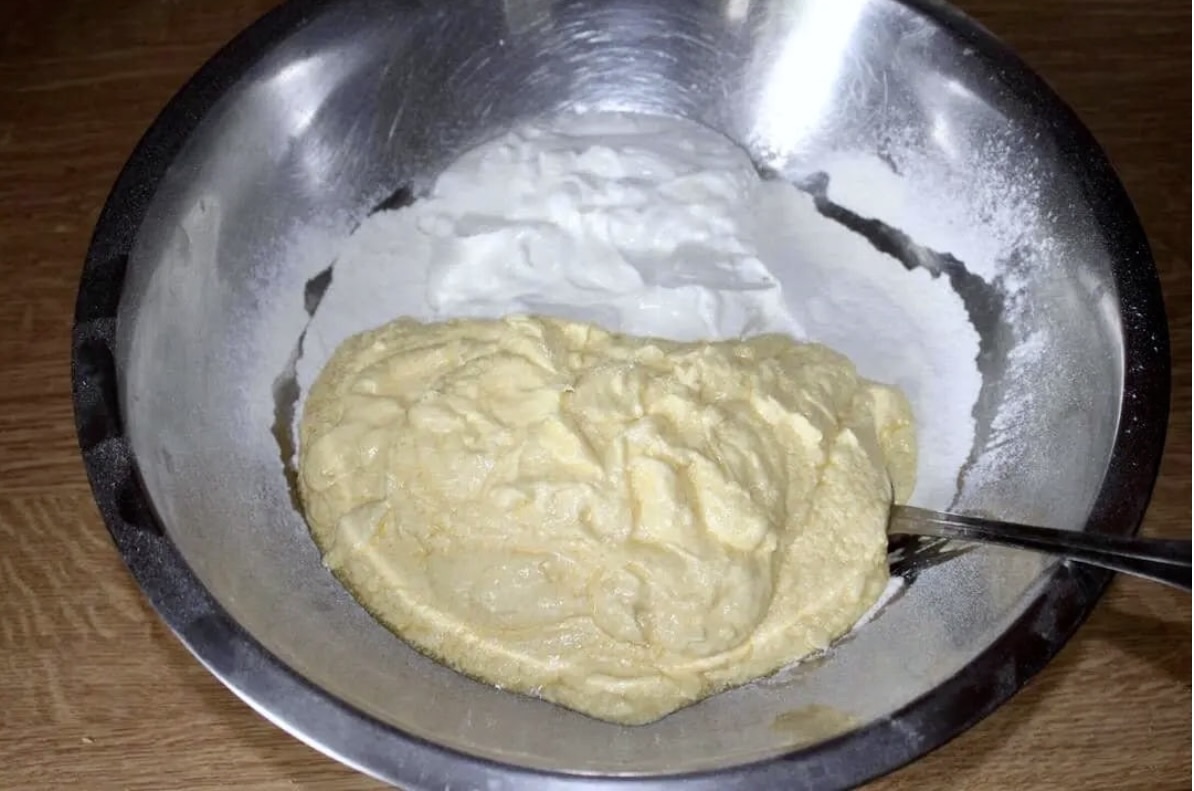 Zmiksowaną masę przełóż do miski z mąką i proszkiem do pieczenia, dodaj również jogurt.