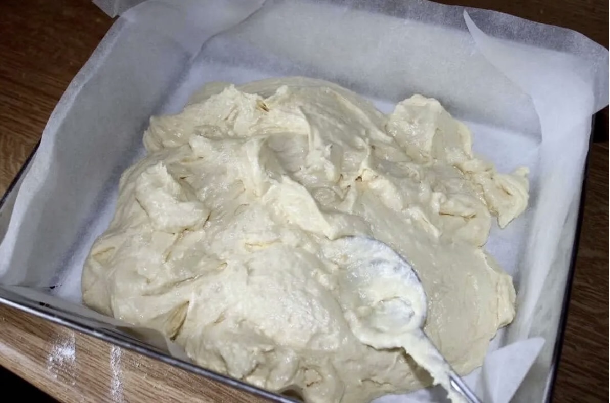 Blachę (o wymiarach np. 26×24 cm) wysmaruj olejem i wyłóż papierem do pieczenia, a następnie rozłóż na niej ciasto.