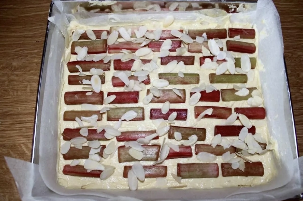 Rabarbar dobrze odcedź z nadmiaru soku i rozłóż go na cieście.