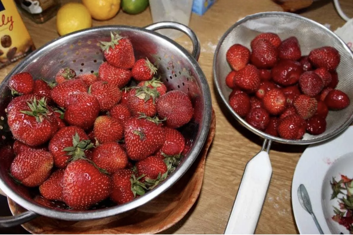 Owoce: W międzyczasie umyj truskawki, usuń szypułki, a następnie pozostaw do odcieknięcia (jeśli są bardzo wilgotne, osusz je ręcznikiem papierowym).
