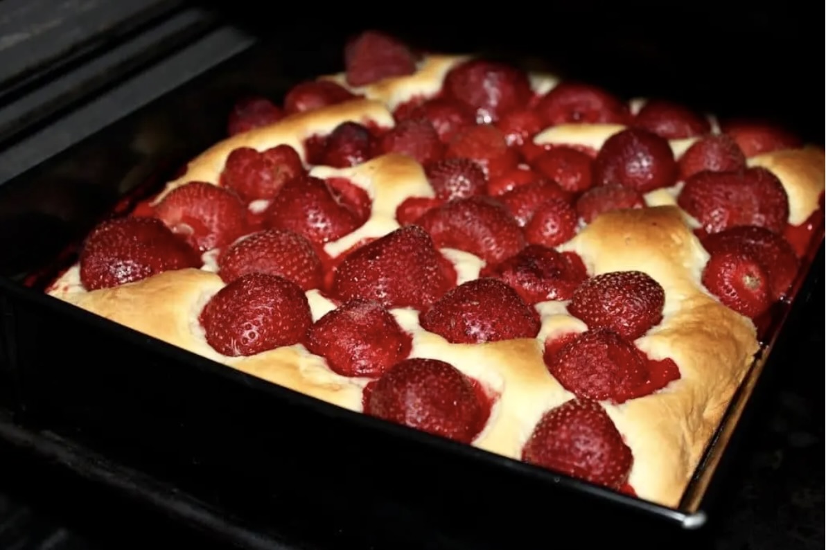 Podanie: Ciasto z truskawkami – po upieczeniu i przestygnięciu obficie posyp cukrem pudrem.