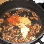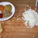 Przyprawy: Do cebuli dodaj starty imbir, kurkumę, mieloną kolendrę oraz pieprz kajeński. Smaż całość przez minutę, aby wydobyć aromat przypraw.