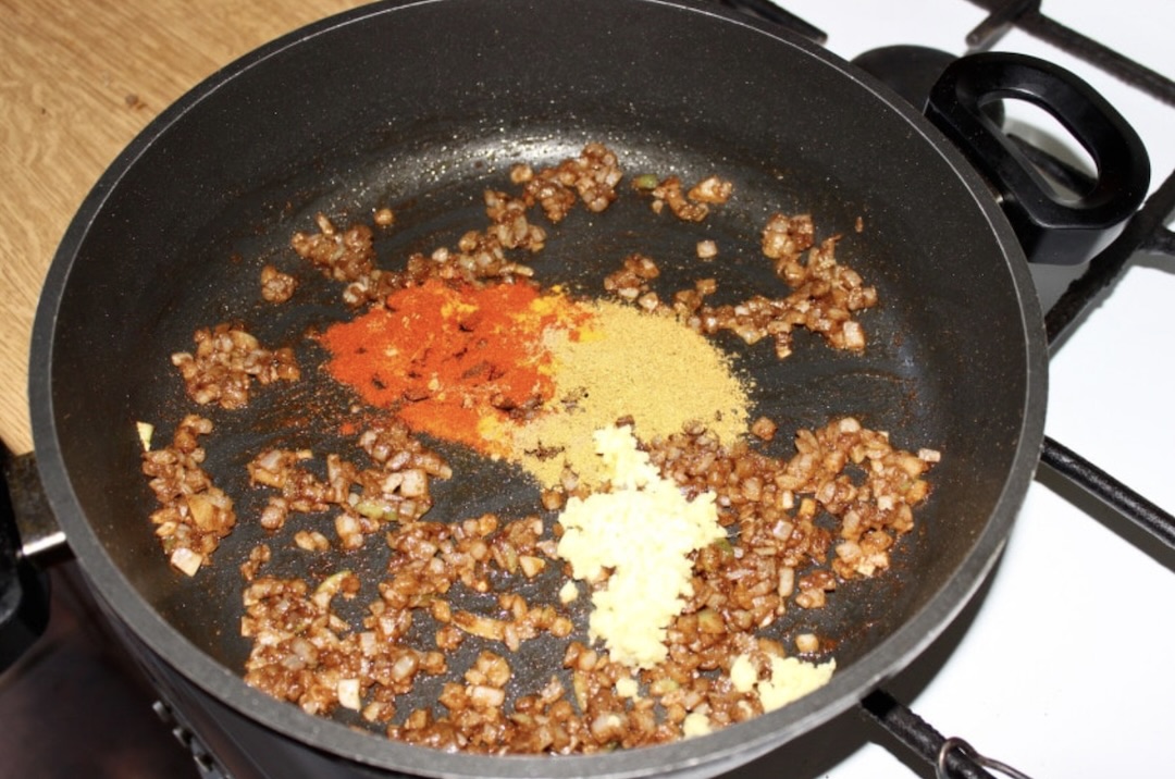 Baza: Cebulę pokrój w drobną kostkę. Na patelni rozgrzej oliwę, wrzuć kmin rzymski, a następnie smaż go przez około 20 sekund, cały czas mieszając. Następnie dodaj cebulę i smaż ok. 5 minut, aż lekko zbrązowieje.