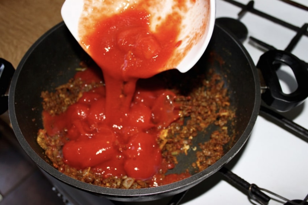Duszenie: Wlej puszkę pomidorów, sok z połowy cytryny oraz pół szklanki wrzącej wody. Posól do smaku, a następnie duś pod przykryciem na małym ogniu przez około 5 minut.