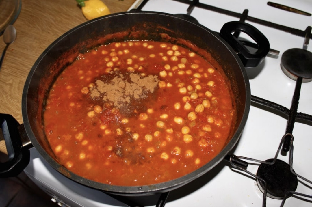 Wykończenie: Dodaj odcedzoną ciecierzycę. Dopraw danie przyprawą garam masala (ok. 1 łyżeczki). Na tym etapie możesz dodać więcej pozostałych przypraw lub soku z cytryny według własnego uznania. Gotuj jeszcze kilka minut.