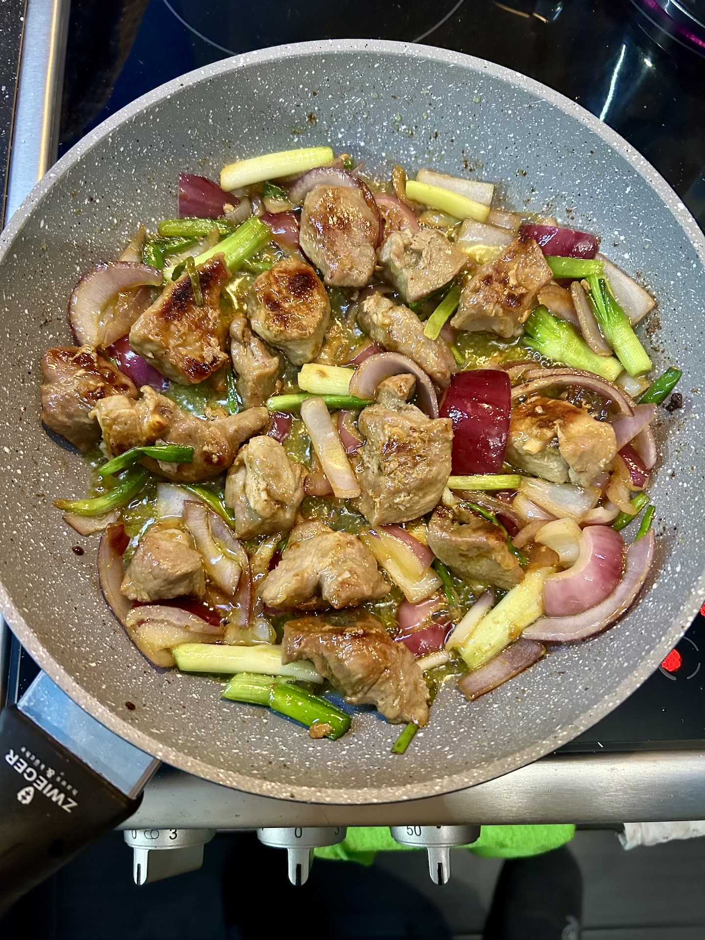 Na patelni rozgrzej oliwę, a następnie obsmaż kawałki cielęciny na mocnym ogniu, aż zaczną się rumienić.