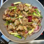 Dodaj posiekaną cebulę oraz dymkę. Smaż przez chwilę, często mieszając, aby warzywa się nie przypaliły.
