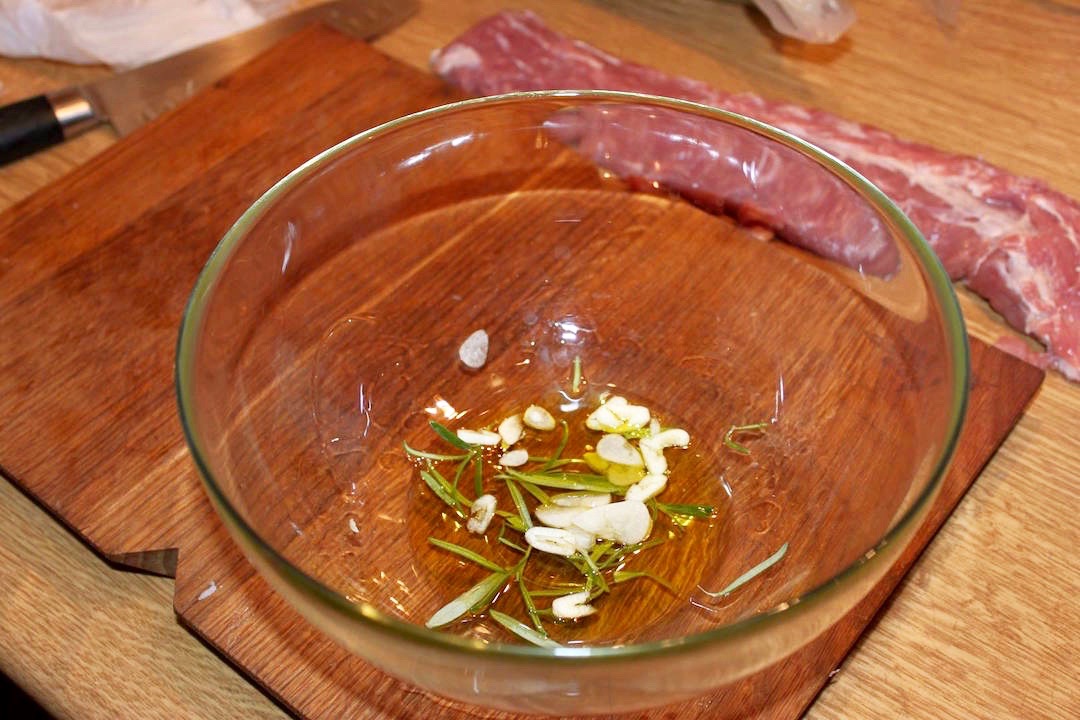 W misce wymieszaj 3 łyżki oliwy extra vergine, obrane i pokrojone w plasterki 3 ząbki czosnku oraz listki z 2 gałązek świeżego rozmarynu.