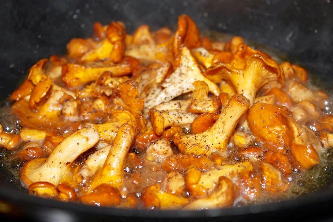 Na osobnej patelni rozgrzej masło klarowane, wrzuć kurki, posól, popieprz i smaż 3-4 minuty, aż nieco zmiękną.