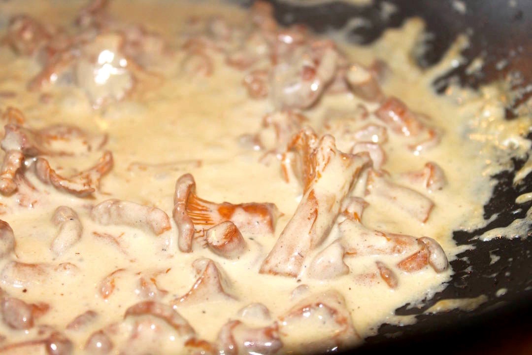 Wlej na patelnię 200 ml słodkiej śmietanki 30% i duś grzyby na wolnym ogniu.