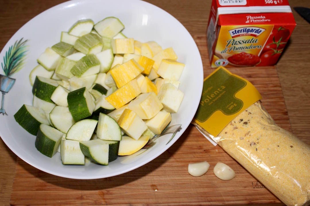 Cukinia duszona w pomidorach i podana na polencie to znakomite, proste i pełne smaku danie. Jest błyskawiczne w przygotowaniu i właściwie całoroczne, choć latem, kiedy dostępność dojrzałych warzyw jest najlepsza oczywiście smakować będzie najlepiej. Aby ten przepyszny gulasz z cukinii skonkretyzować proponuję do niego polentę np. z grzybami. Jeżeli jednak nie dasz rady kupić takiej użyj zwykłej kaszki kukurydzianej, do której pod koniec przygotowania dodaj grubo posiekane świeże zioła (np. oregano, tymianek, rozmaryn).