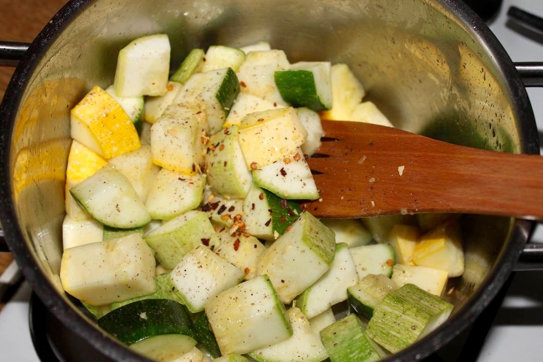 Cukinia: Umyj cukinię i pokrój ją w kostkę „na jeden kęs”.
