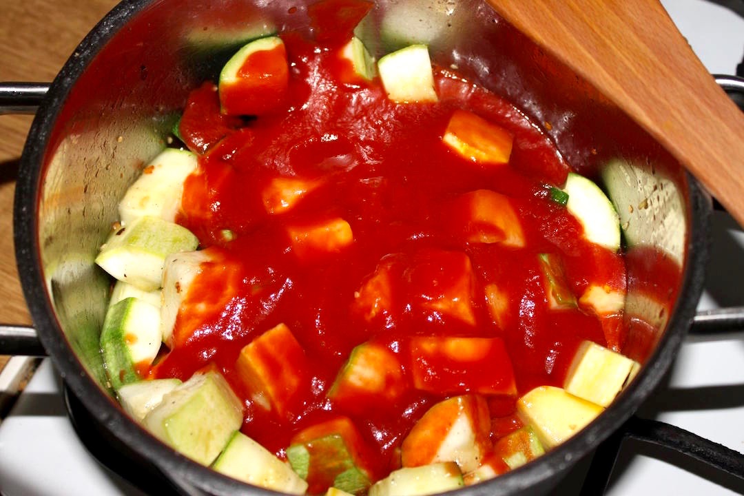 Warzywa i baza: 1 kg cukinii, 500 ml przecieru pomidorowego (passaty) – w sezonie można użyć świeżych pomidorów.