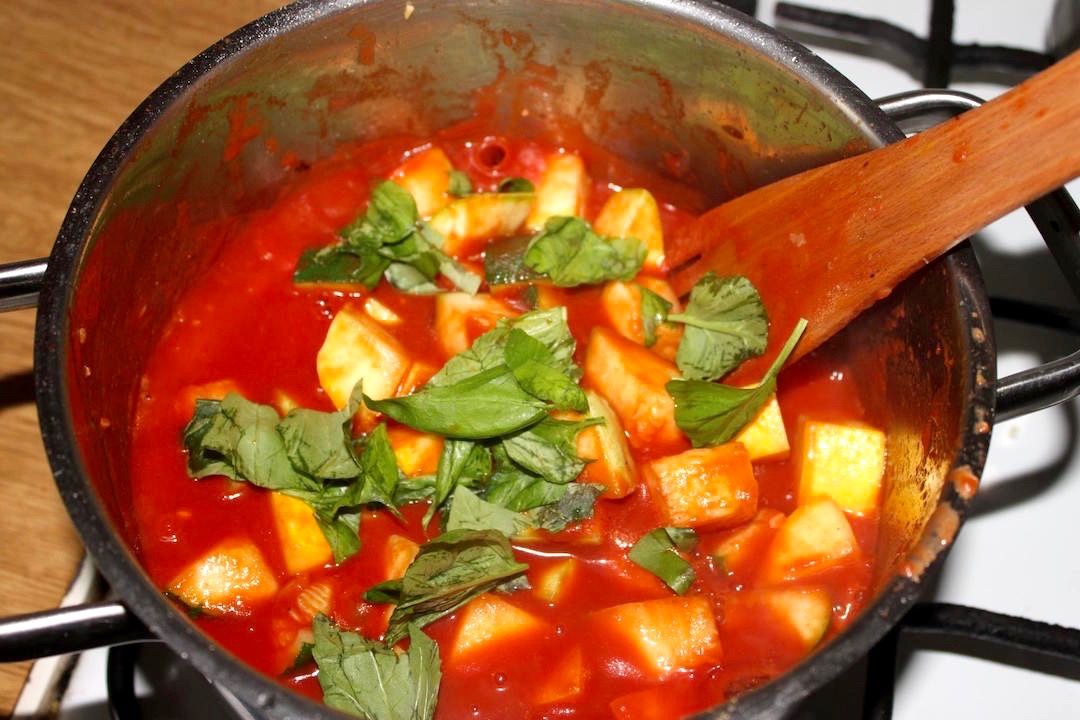 Duszenie: Wlej passatę (lub starte pomidory), wymieszaj i smaż kolejne 2 minuty. Następnie dodaj poszarpaną bazylię i jeszcze jeden zgnieciony ząbek czosnku. Przykryj i duś na wolnym ogniu przez 15 minut (cukinia ma pozostać al dente).