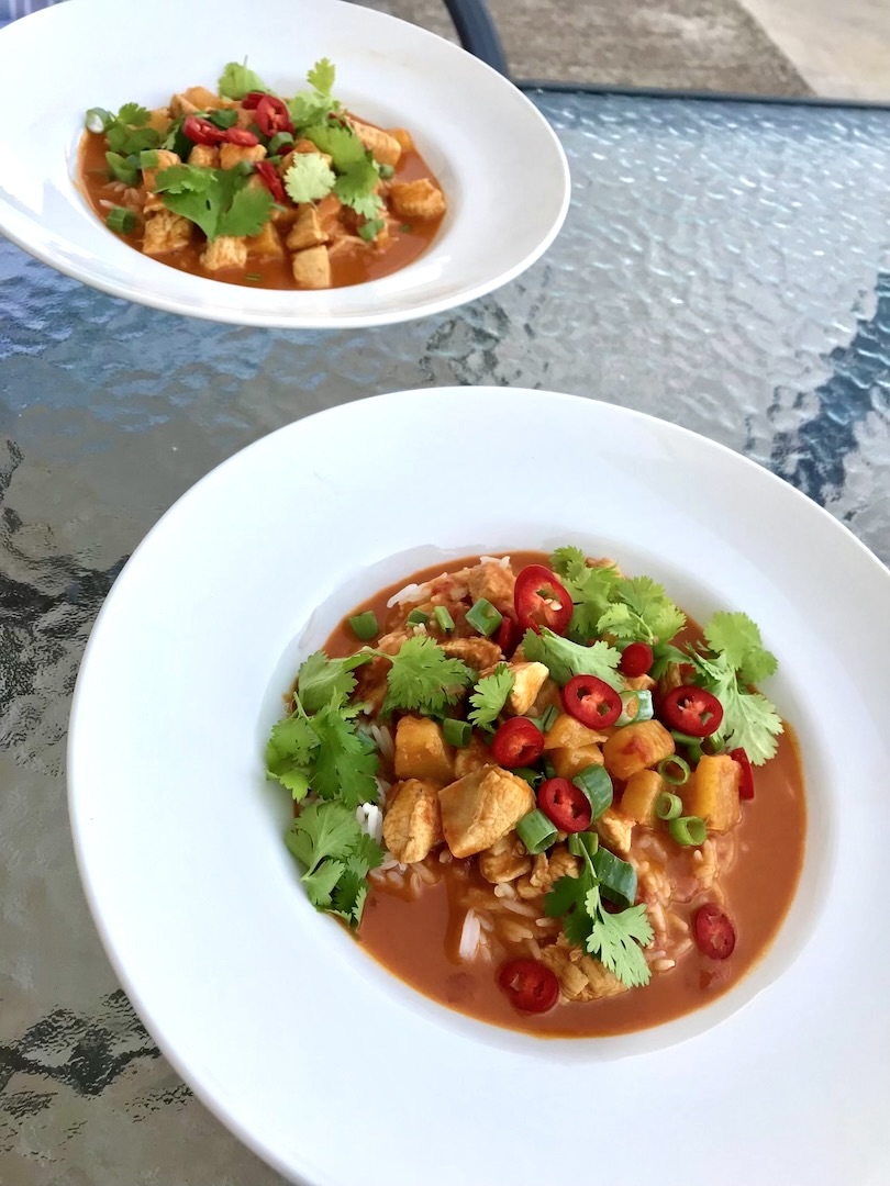 Curry dla opornych to łatwa wersja tego popularnego dania ze wschodu. Pokrojonego w kostkę kurczaka doprawić należy czerwoną pastą curry i razem ze świeżym, krojonym ananasem dusić krótko w mleczku kokosowym. Danie podaje się z drobno siekaną papryczką chilli i listkami świeżej kolendry. To danie jest bardzo aromatyczne i po prostu pyszne. Nawet jeśli nie jesteś fanem kuchni wschodnich to jestem pewien, że tak przygotowany kurczak naprawdę Ci zasmakuje.