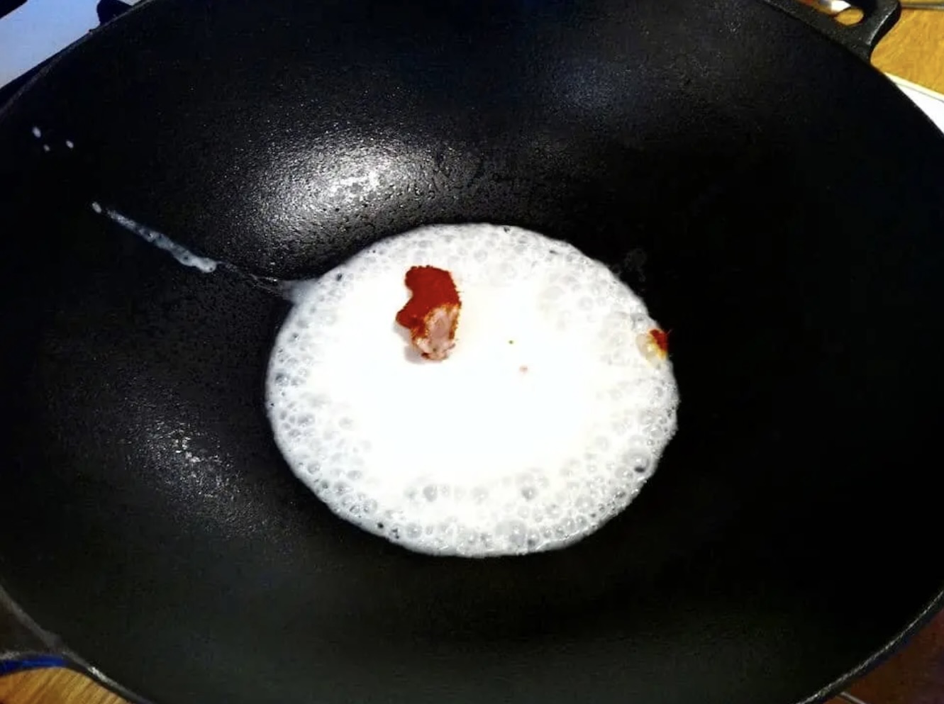 Smażenie pasty: Rozgrzej woka lub patelnię i wlej odrobinę mleczka kokosowego (resztę zachowaj na później). Dodaj pastę curry, wymieszaj i gotuj na małym ogniu przez około 3 minuty, aby uwolnić aromaty.