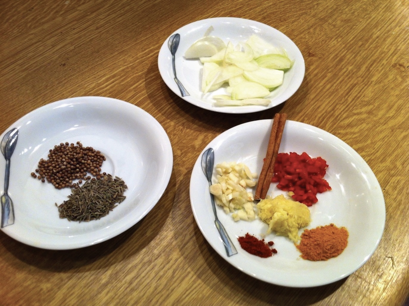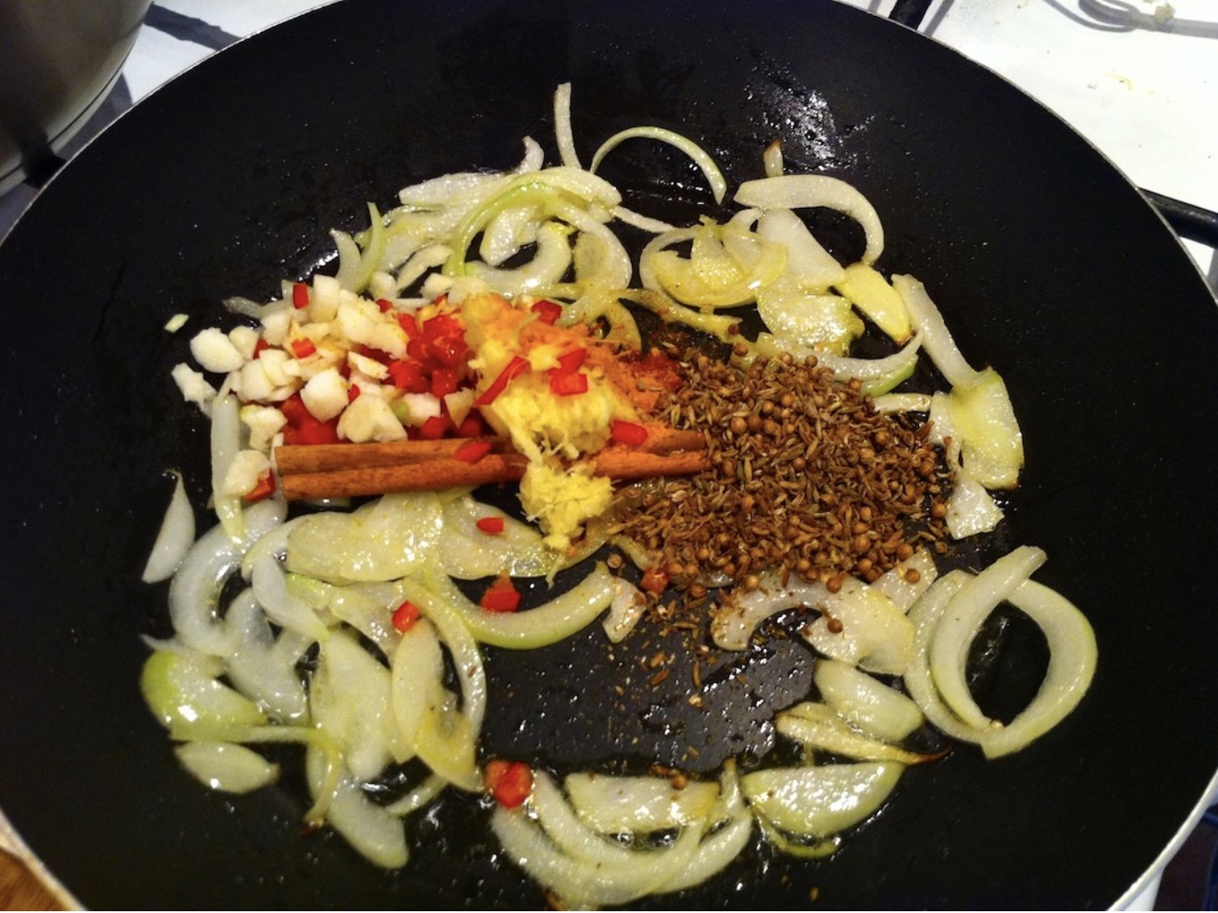Do zeszklonej cebuli dodaj uprażone i zmiażdżone przyprawy, posiekany czosnek, chilli, kurkumę, cynamon oraz starty imbir.