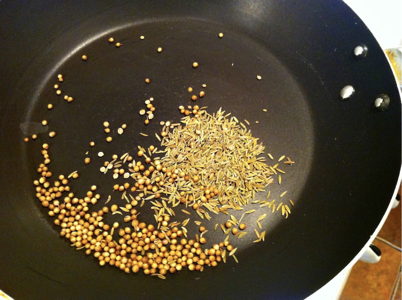 Podgrzej małą patelnię. Wsyp ziarna kolendry i kminu rzymskiego (po 1 kopiatej łyżeczce). Praż około 1 minuty na niezbyt mocnym ogniu, aż uniesie się ich zapach. Uważaj, aby przypraw nie przypalić.