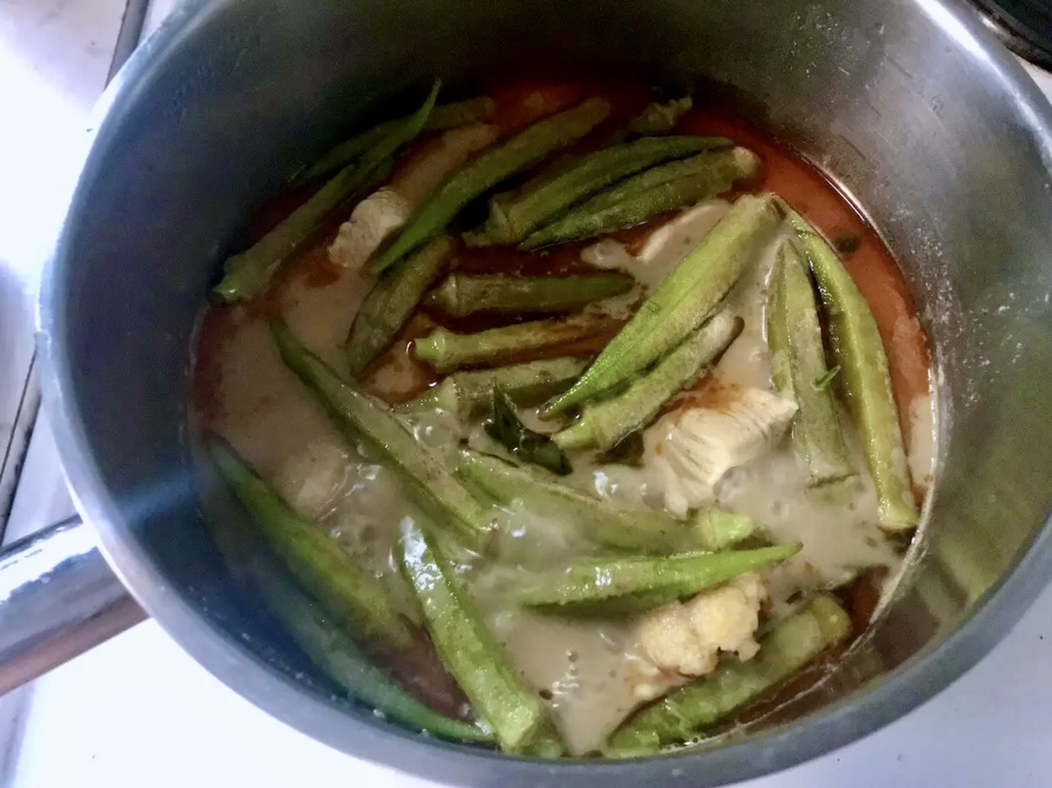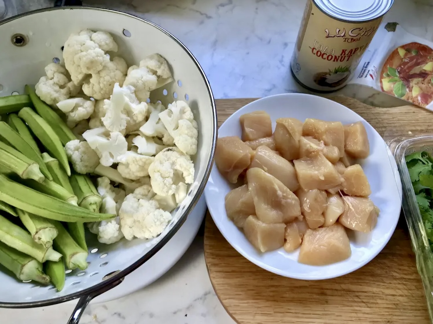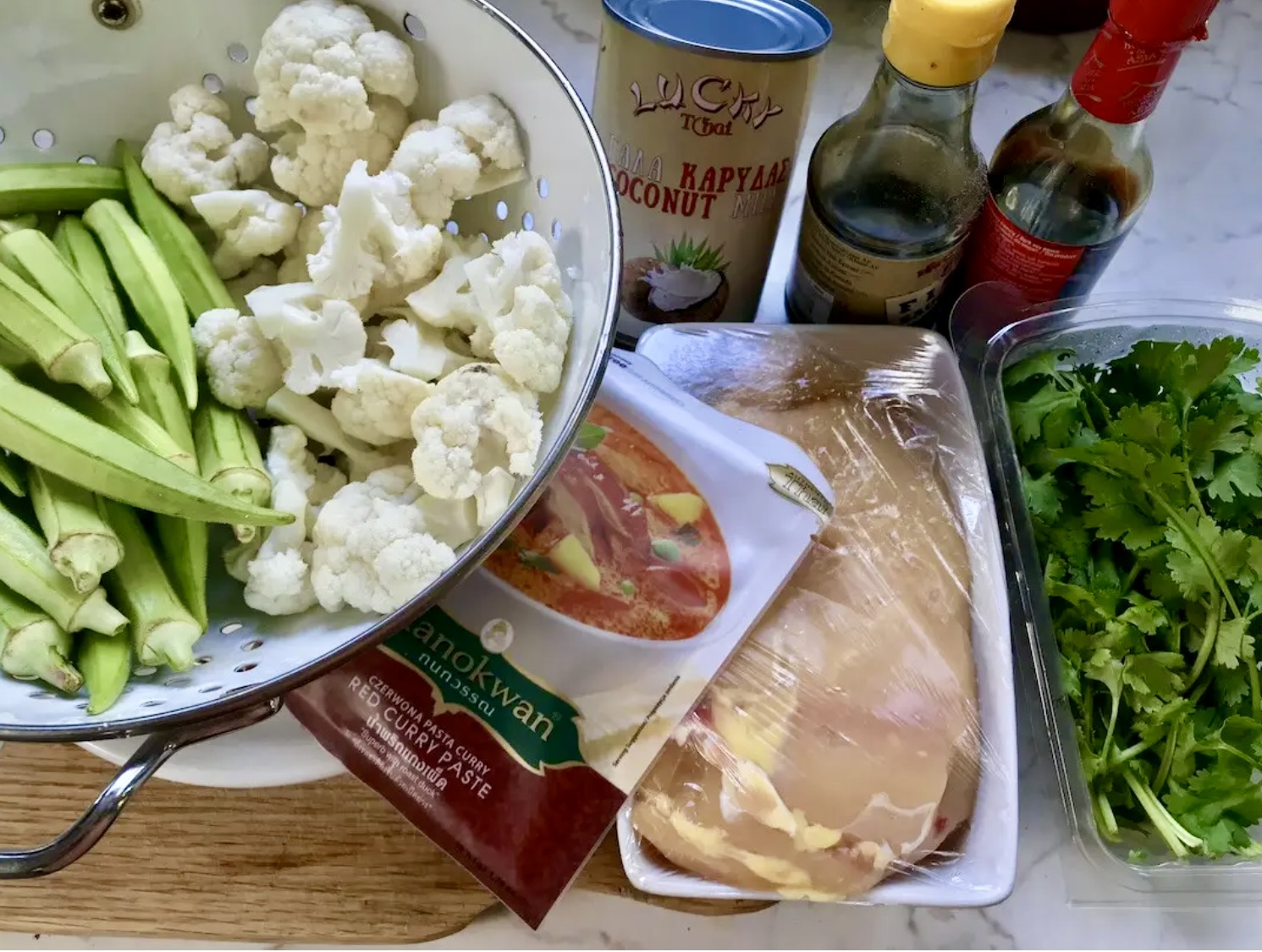 To potrawka z kawałków piersi z kurczaka duszonych w mleczku kokosowym z dodatkiem pasty curry, kalafiora, okry i świeżej kolendry.