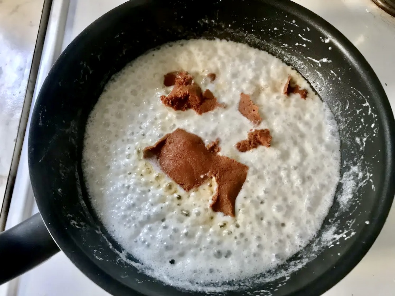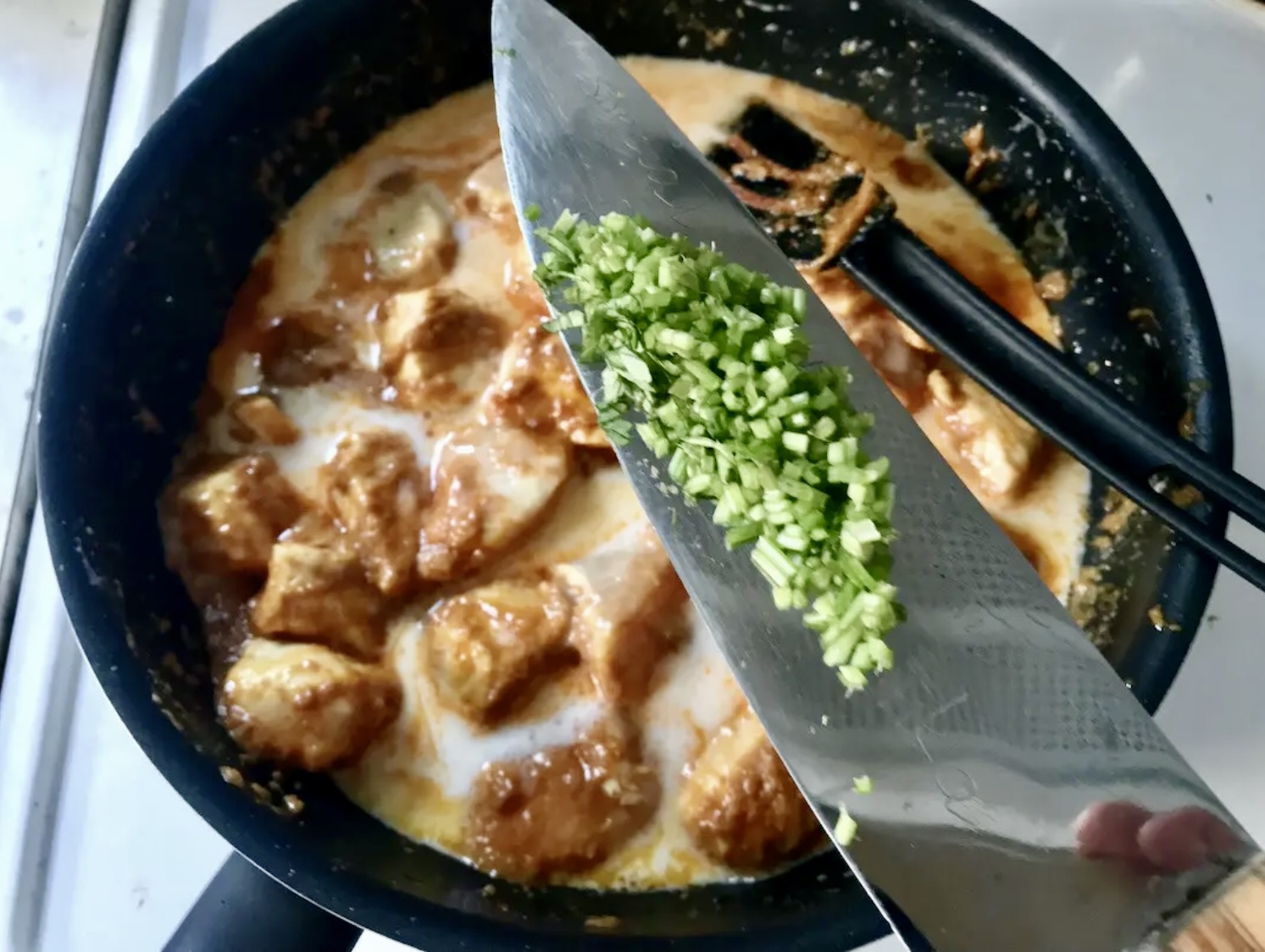 Na patelnię wlej połowę mleczka kokosowego i gotuj na średnim ogniu, aż znacznie zredukuje objętość i zgęstnieje.
