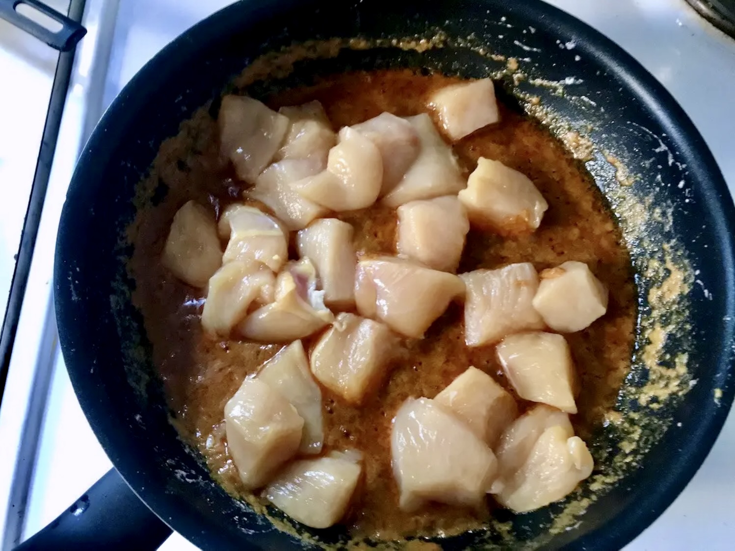 Włóż kurczaka, wymieszaj, aby pokrył się pastą.