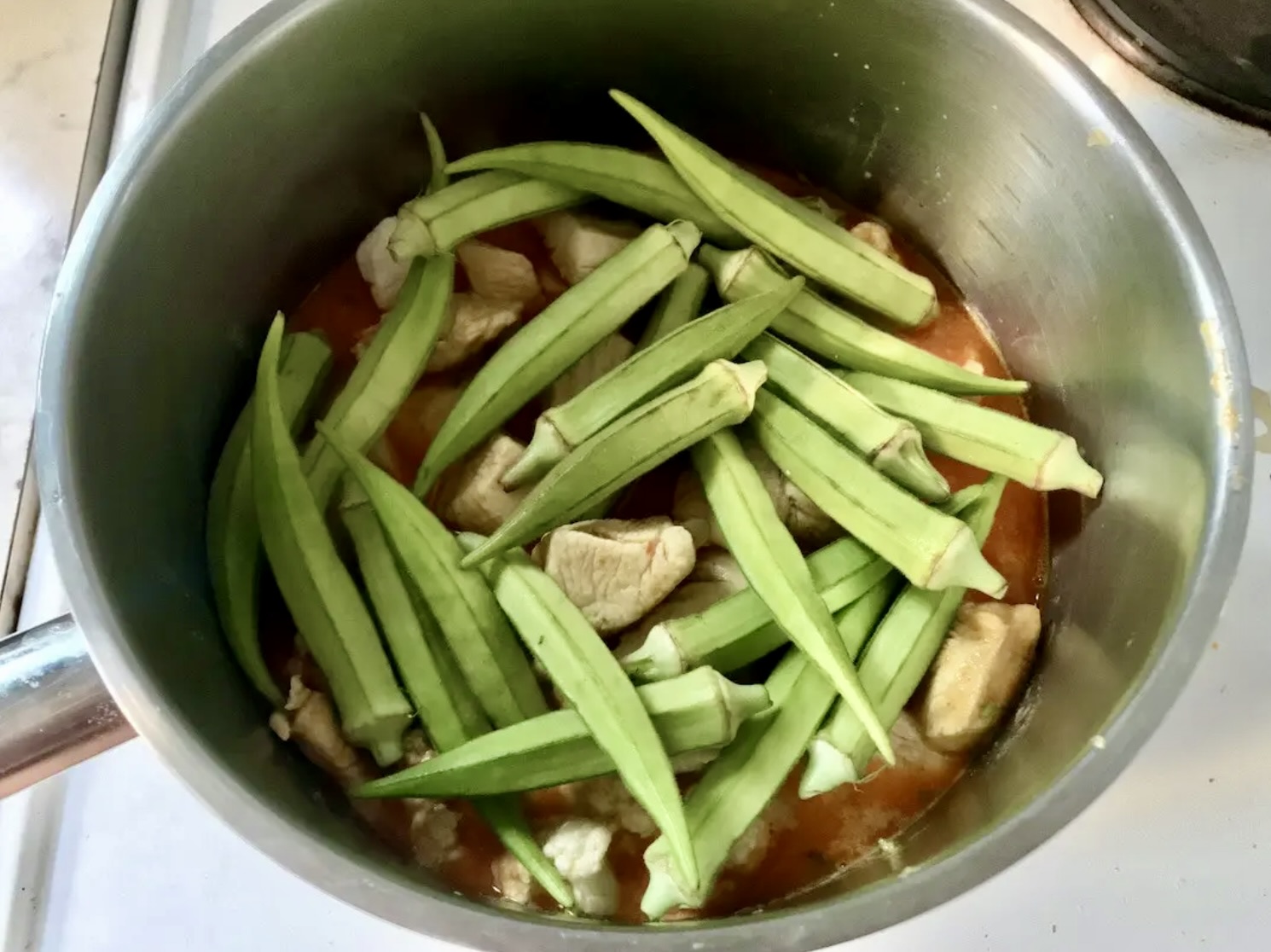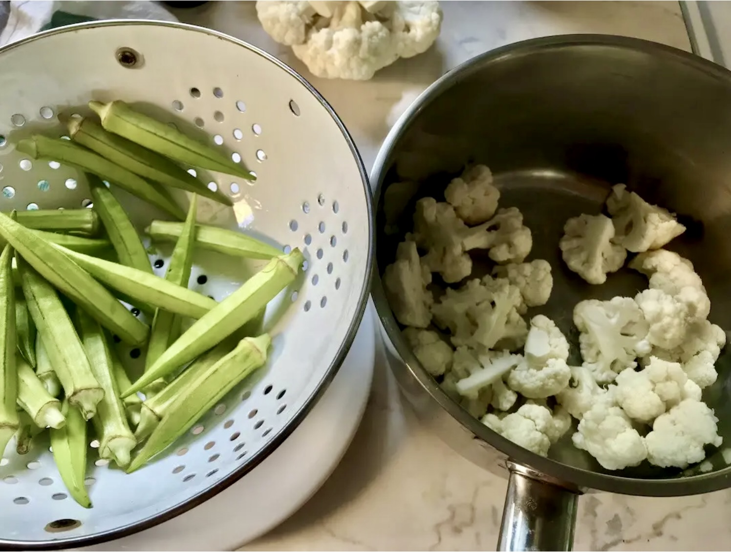 Przelej zawartość patelni do garnka z kalafiorem. Na wierzchu rozłóż okrę.