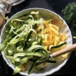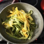 Przygotowanie cukinii: Umyj, osusz i pokrój cukinie w cienkie paski o długości zbliżonej do makaronu (mają wyglądać jak tagliatelle warzywne).