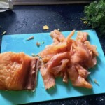 Przygotowanie łososia: Łososia wędzonego podziel na małe kawałki lub paseczki. (Jeśli używasz łososia surowego, należy go lekko podsmażyć z cukinią).
