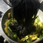 Czarny makaron z łososiem jest to makaron zabarwiony atramentem mątwy połączony z tagliatelle warzywnym z cukinii oraz z dodatkiem wędzonego łososia. To prosta i błyskawiczna kombinacja wybornych smaków. Barwiony sepią makaron ma niesamowity, czarny kolor i bardzo delikatny posmak morza. Znakomicie kontrastuje z kolorowymi warzywami, czy właśnie wędzonym łososiem. W daniu użyłem linguine, czyli stosunkowo cienkiego i płaskiego makaronu. Dobrze, aby cukinie pokroić w zbliżonej grubości paski. Wtedy danie na talerzu prezentować się będzie jeszcze lepiej. Łosoś koniecznie powinien być wędzony na zimno, ewentualnie surowy, ale wtedy należy go lekko podsmażyć z cukinią.