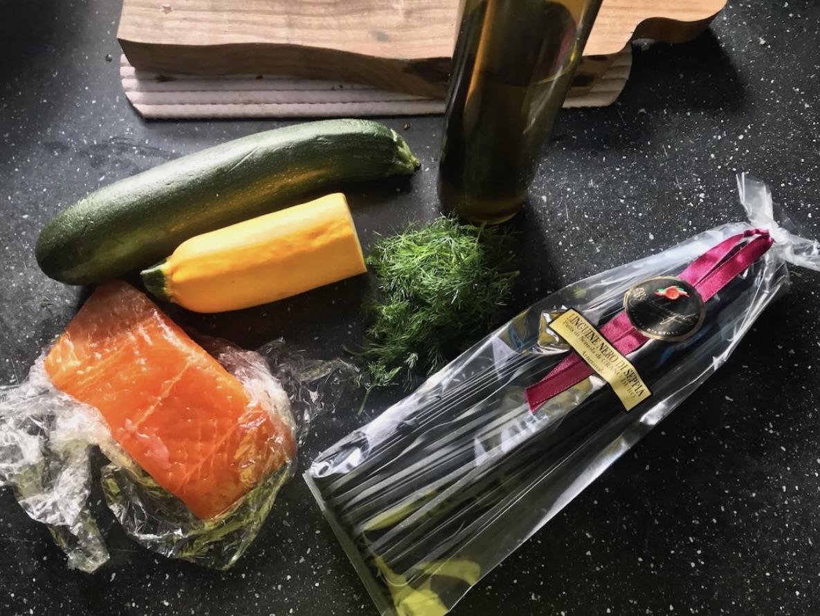 Podanie: Wyłóż makaron z cukinią na talerz. Na wierzchu rozłóż kawałki wędzonego łososia, a całość posyp posiekanym koperkiem.