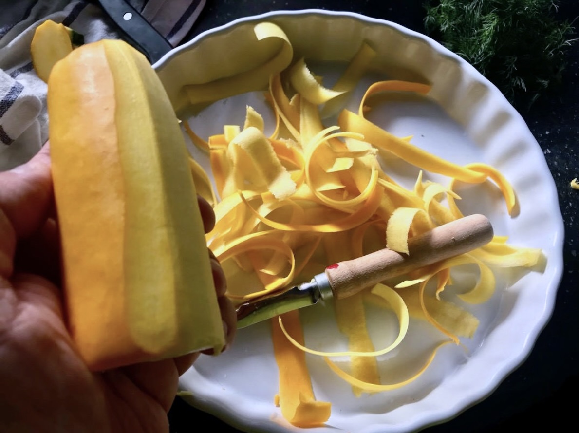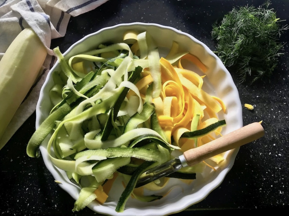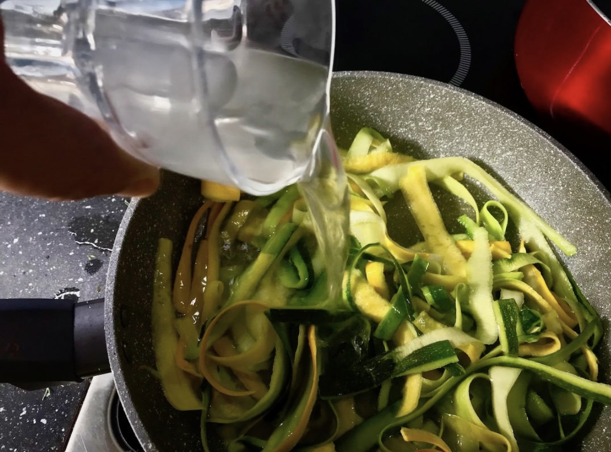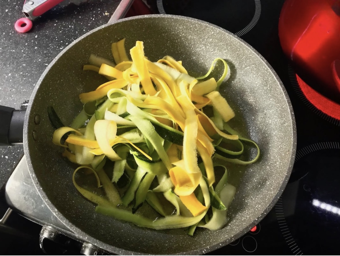 Przygotowanie cukinii: Umyj, osusz i pokrój cukinie w cienkie paski o długości zbliżonej do makaronu (mają wyglądać jak tagliatelle warzywne).