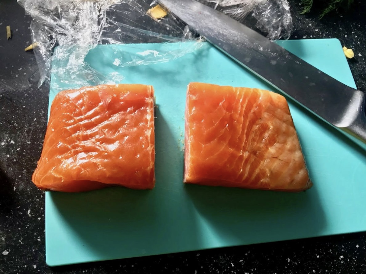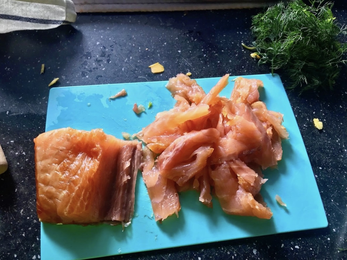 Przygotowanie łososia: Łososia wędzonego podziel na małe kawałki lub paseczki. (Jeśli używasz łososia surowego, należy go lekko podsmażyć z cukinią).